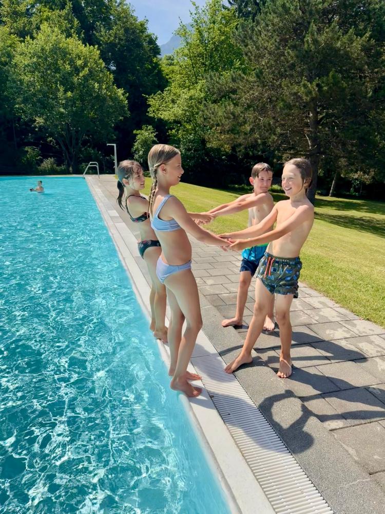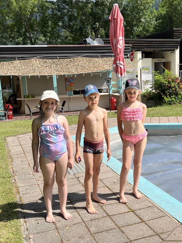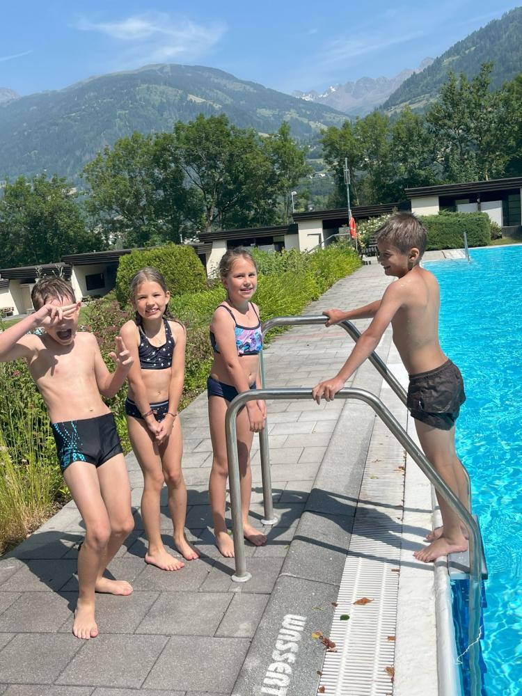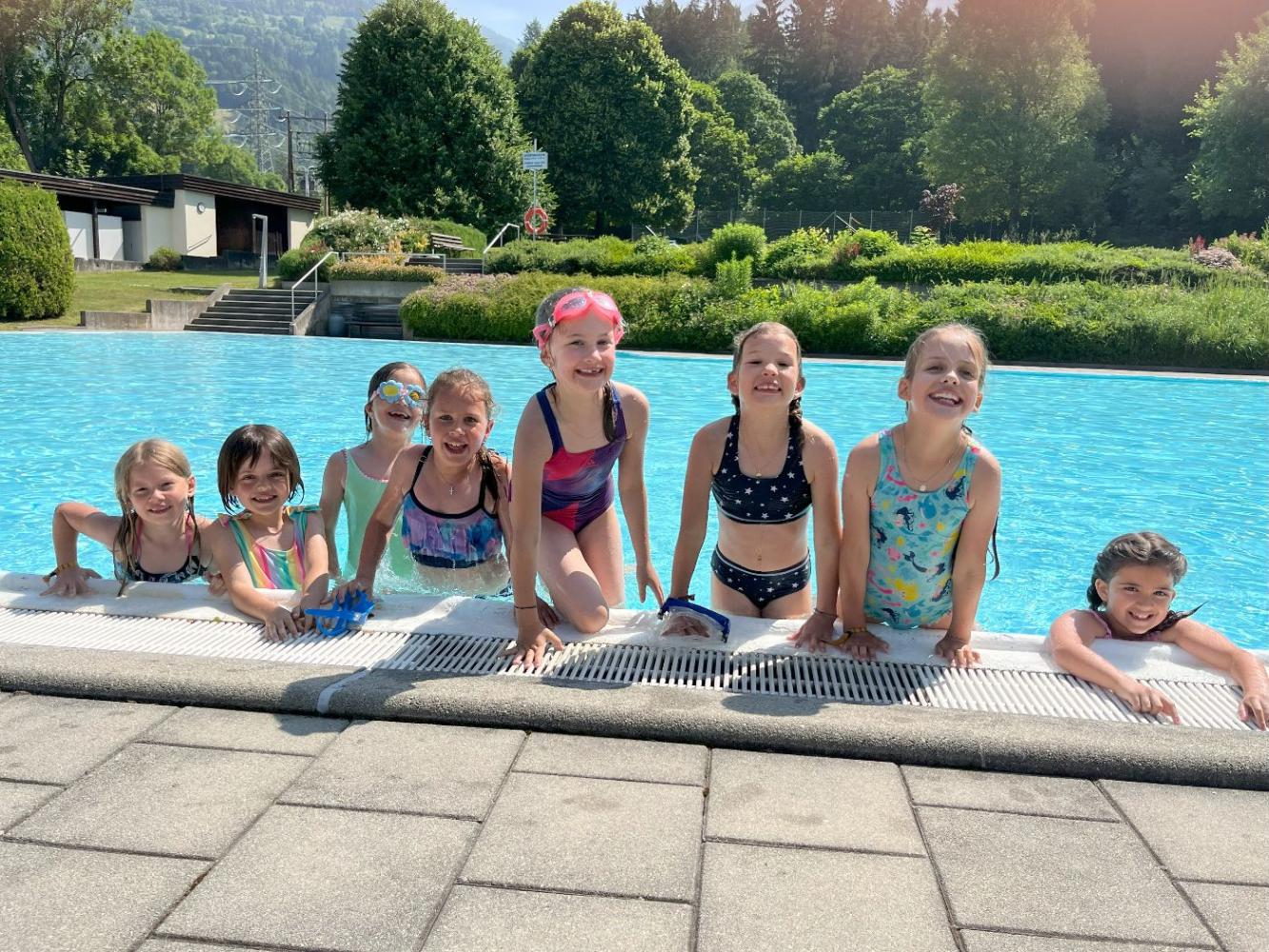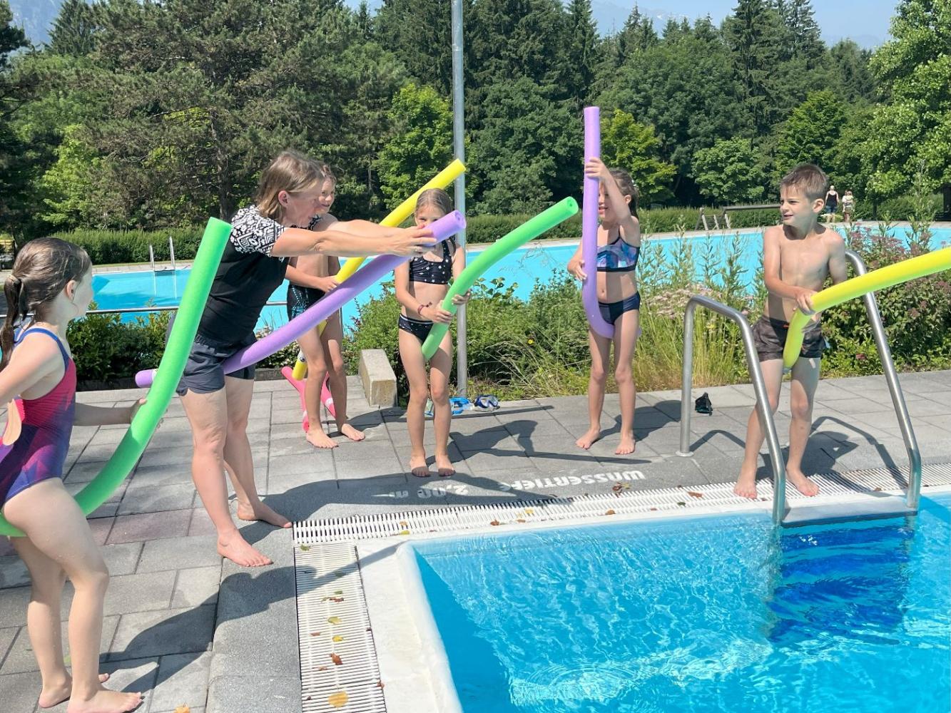 Bei herrlichem Sommerwetter genossen die Kinder unserer Schule den Schwimmunterricht im Schwimmbad Dölsach: Schwimmtraining mit Trainerin Brigitte Mair, Tauchen, Springen vom Sprungsockel, Spiele im Wasser und auf der Wiese ….. – nach dem Motto „Spaß im kühlen Nass!“