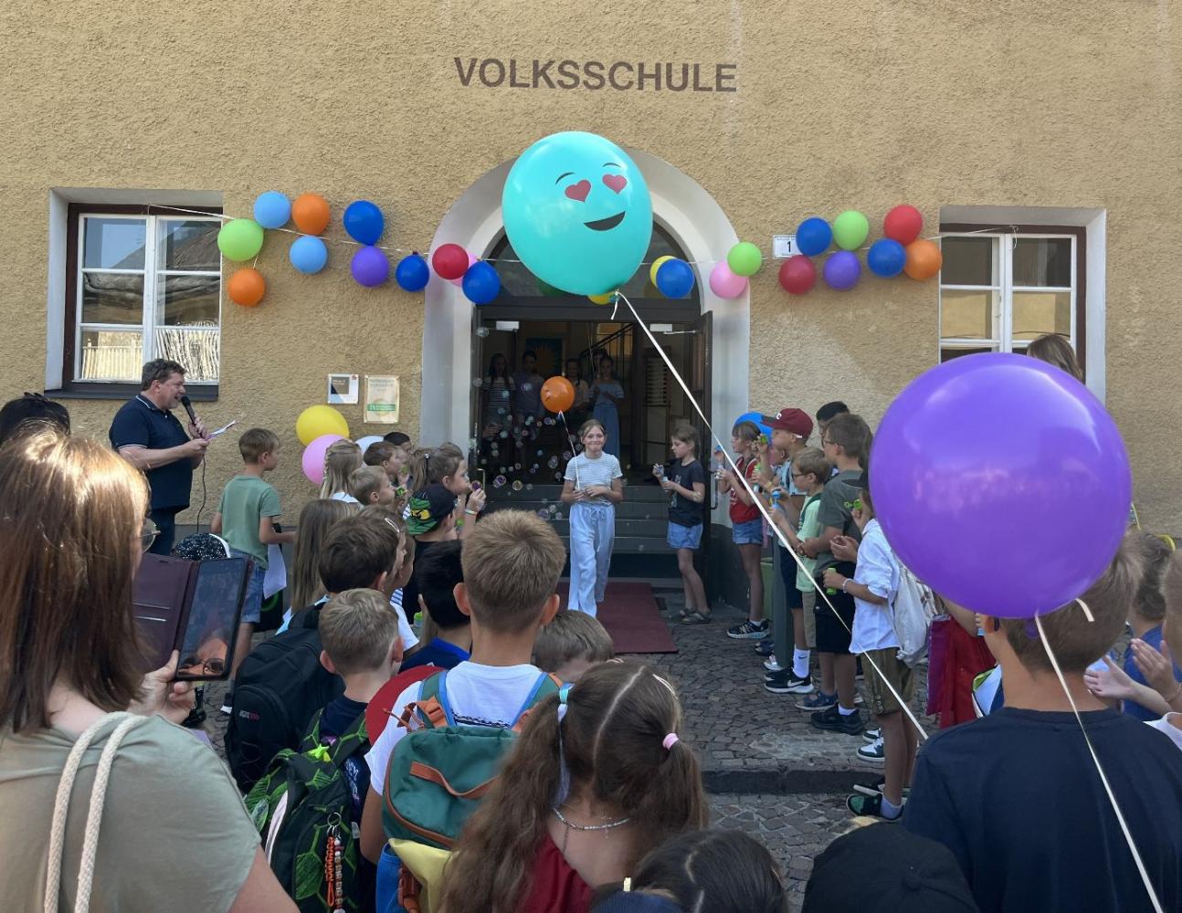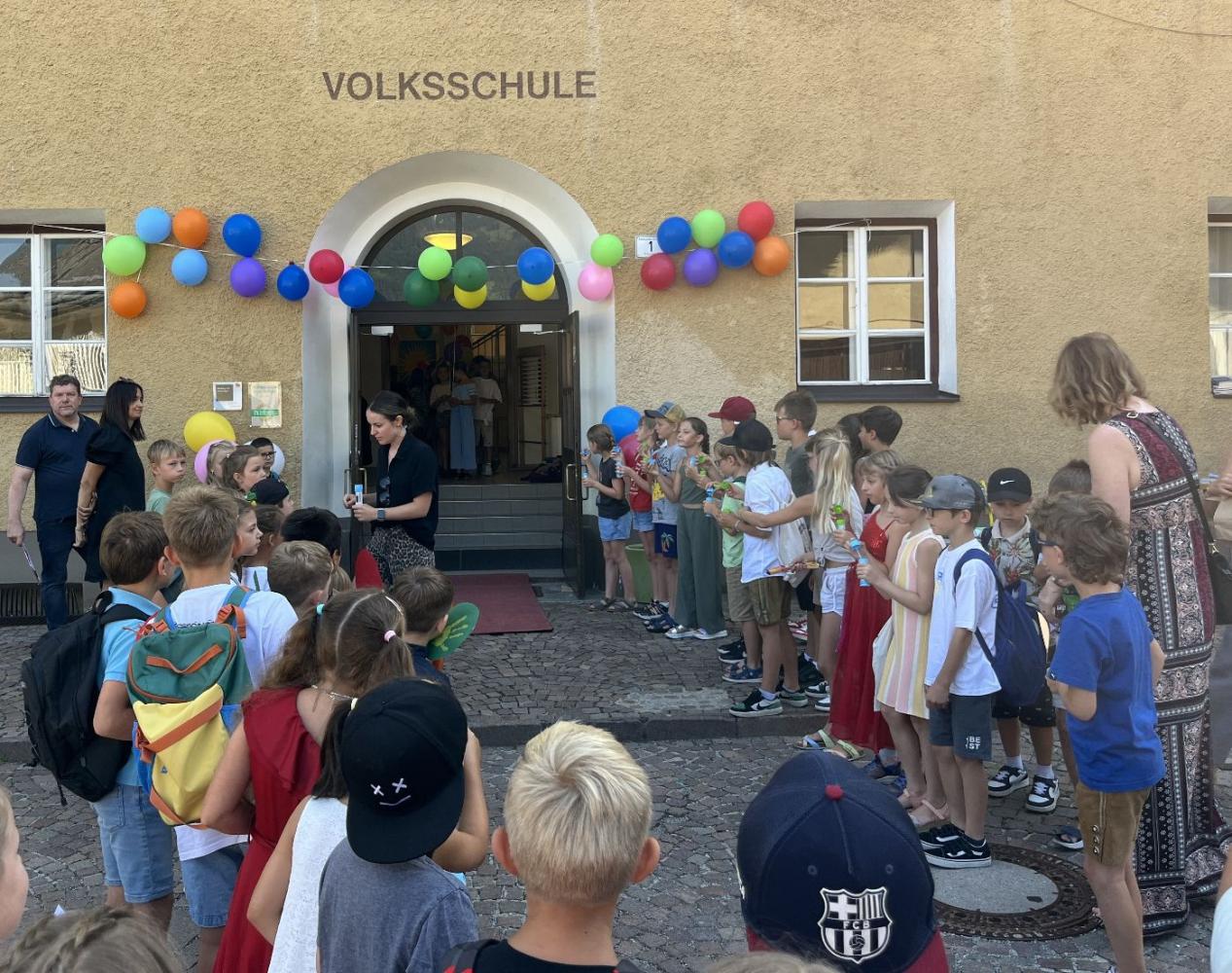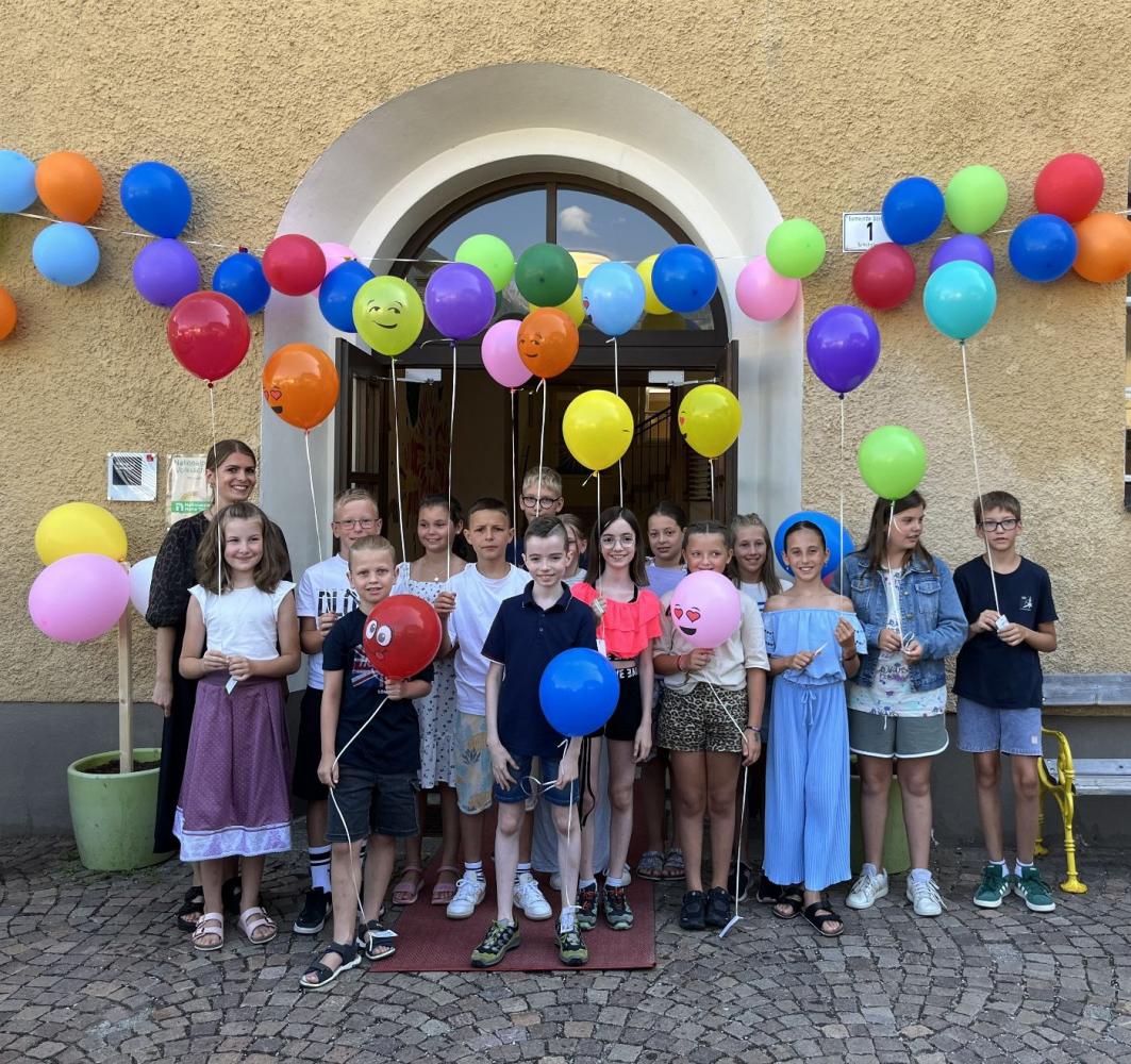 Mit einer stimmungsvollen Feier organisiert von Schule und Elternverein wurden die Viertklässler verabschiedet. Über einen roten Teppich zogen sie unter Applaus und Seifenblasen durch das Spalier der jüngeren Schüler:innen aus dem Schulhaus.