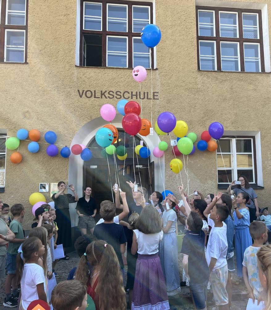 Zum Abschluss erfolgte noch das gemeinsame Steigenlassen bunter Luftballons – so wie vor vier Jahren an ihrem ersten Schultag.