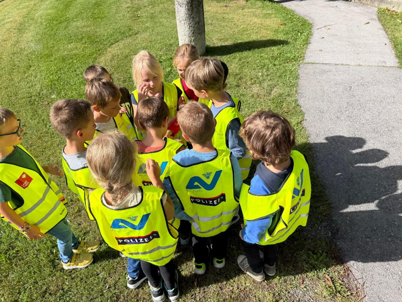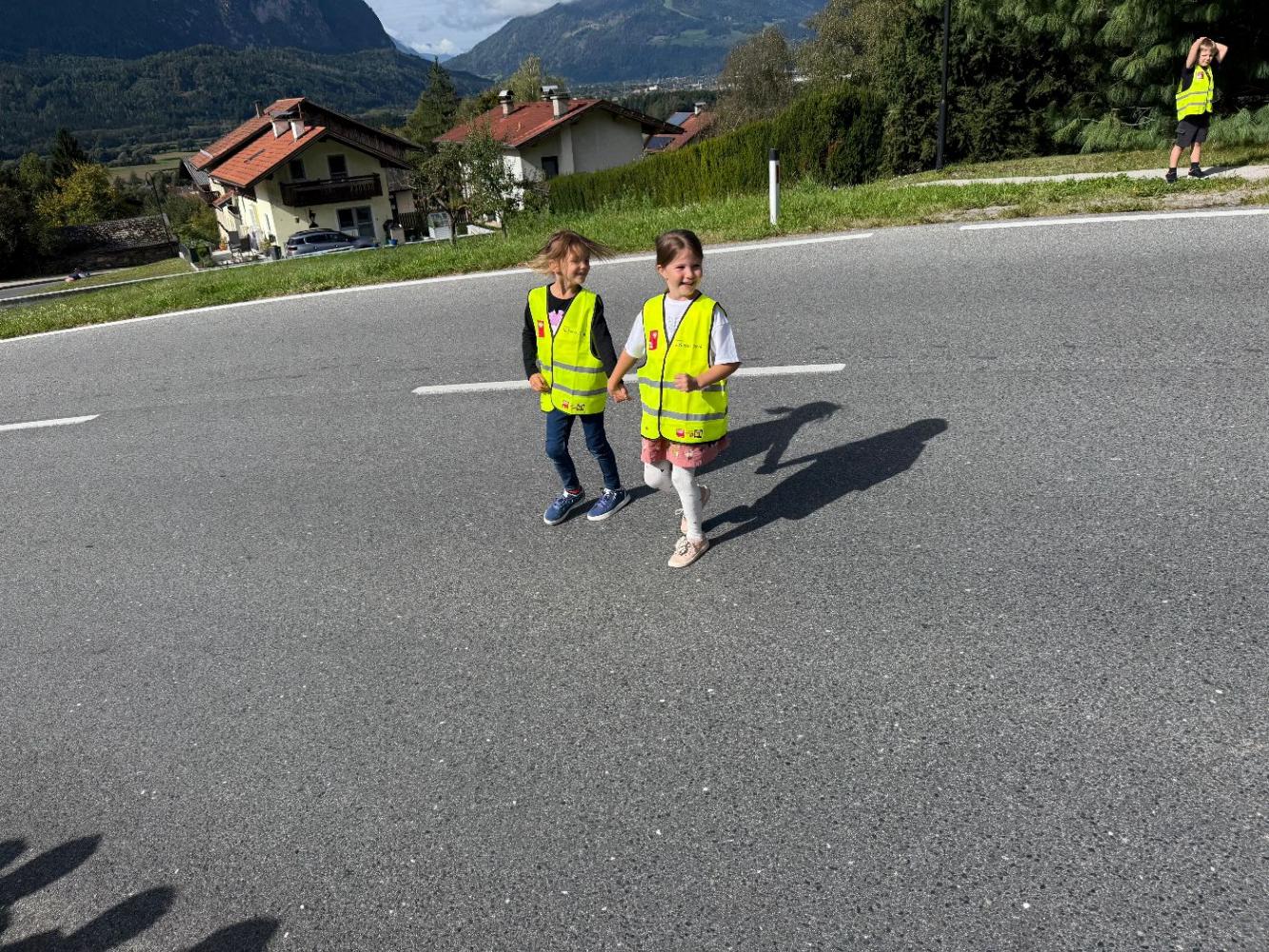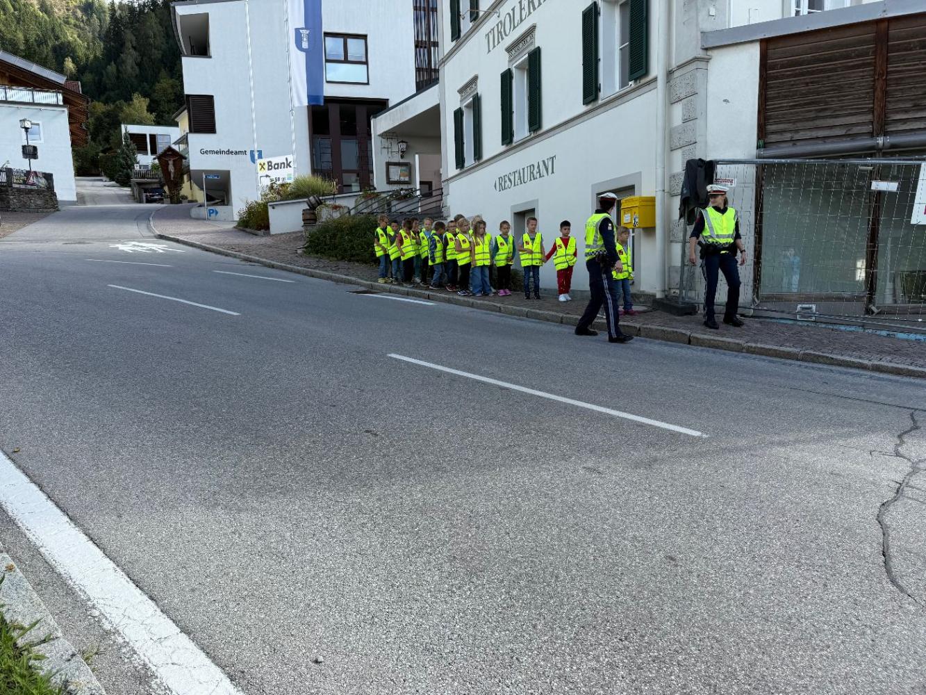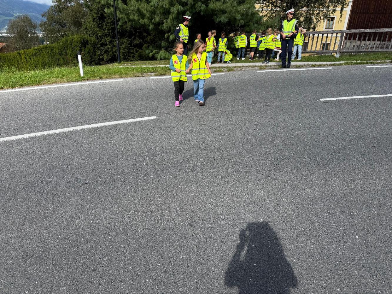 Dabei übten sie das sichere Überqueren der Fahrbahn und besprachen mögliche Gefahren, die auf dem Schulweg lauern.